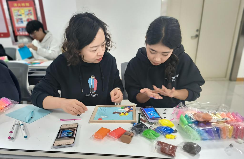 活动伊始,工作室雅致温馨,长桌摆满各色粘土与工具。文学教研室邱才瑛老师以优美导语开启旅程,她先谈及“诗中有画,画中有诗”是文人雅士自古追求的艺术境界,随后深入讲解非遗泥塑文化。她介绍,泥塑非遗历史悠久,新石器时代的陶羊便见雏形,唐宋时的彩塑菩萨和“磨合乐”使得泥塑作品走向兴盛,明清更是南北流派纷呈。代表作品如天津“泥人张”的《惜春作画》、惠山泥人的《大阿福》,以鲜活造型传递生活气息。她希望学生们在创作中,让诗词意境与非遗温度交融共生。